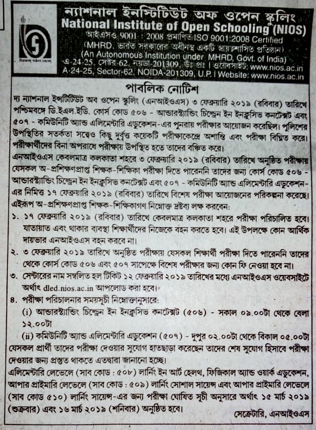 আমাদের দাবী মেনে নিয়েছে NIOS কর্তৃপক্ষ তারা আজ জনবিজ্ঞপ্তি দিয়েছে যারা গত রবিবার পরীক্ষা দিতে পারেননি তারা আগামি ১৭ তারিখ পুনরায় পরীক্ষা দেবে এবং ১২ তারিখ থেকে হলটিকিট সংগ্রহ করবে।